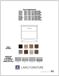 Deco nightstands by Lang Furniture feature a high-pressure laminate construction with front-kick plates and chrome-plated pull bars. Available with drawer or shelf. Option to create a two tone matching nightstand to headboard. Choose from 8 finishes. Made in the USA.
